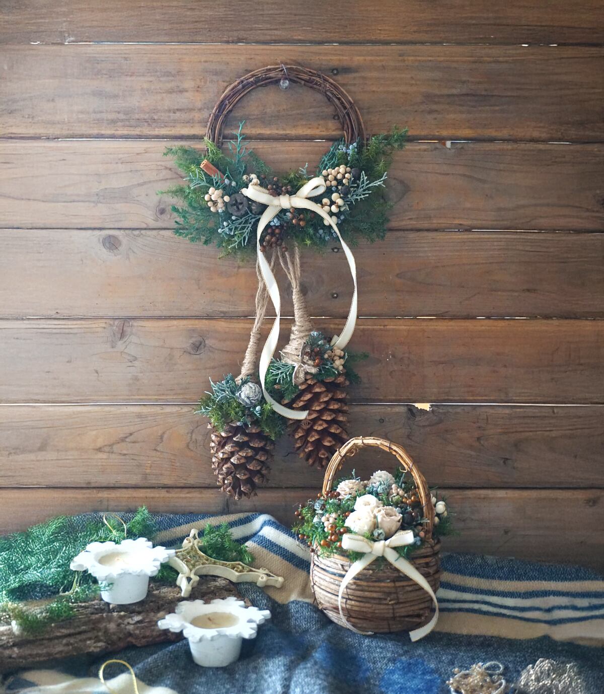 秋の彩りを楽しむ2つのデザインからお選びいただけます。ふんわり広がるパンパスグラスや秋色の草花を使ったスワッグと、自然素材の白樺枝を使ったバスケット風アレンジ。