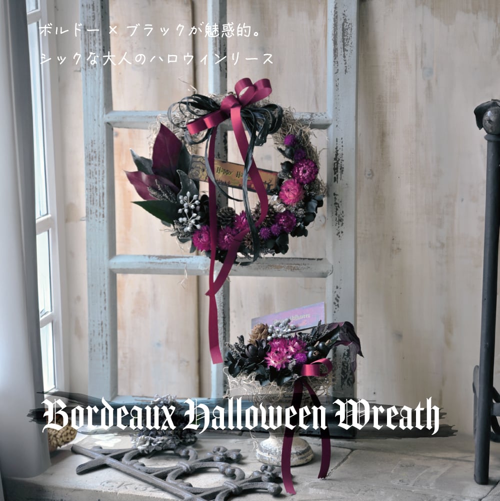 直径20cmのリースベースに、木の実が奏でる温もりと、ボルドーカラーのドライフラワーが添える優しさをギュッと詰め込みました。そこに、ちょっぴりミステリアスな黒の素材を散りばめて、まるで魔女の魔法がかかったような、あたたかみのあるハロウィンリースが完成します。