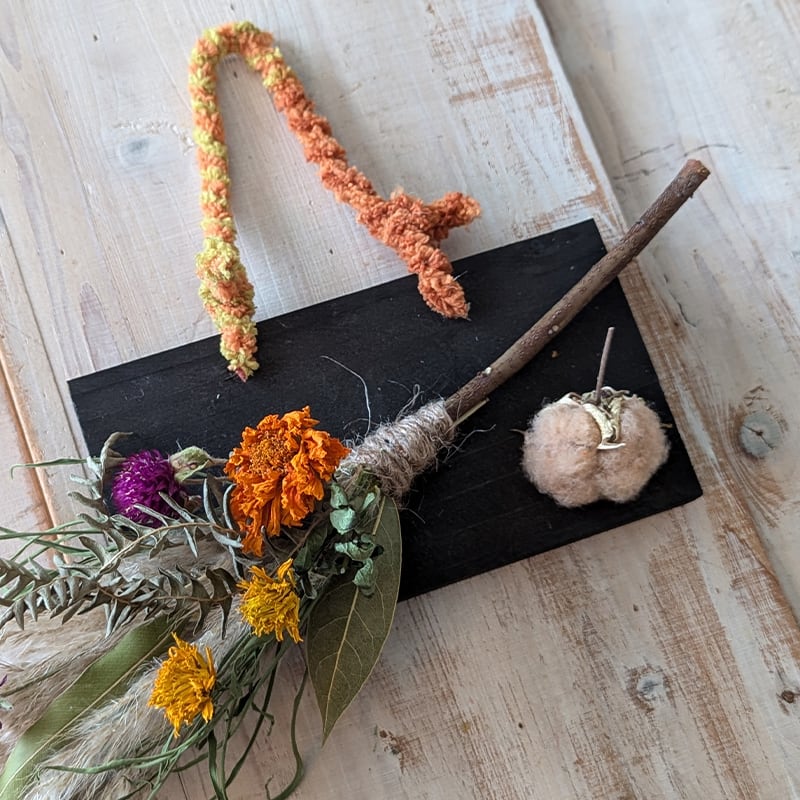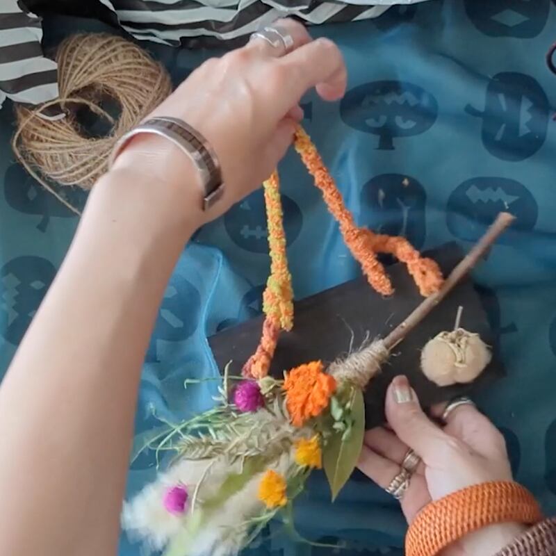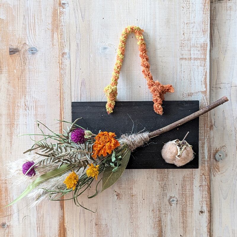 パンパスグラスを使用した箒のフォルムは、魔女が使っていそうなイメージで作ります。ハンドメイドならではの温かみとクオリティで、お部屋や玄関先をハロウィンムードに彩ります。