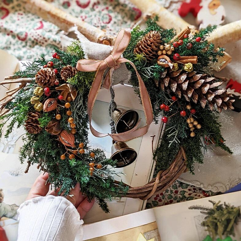 ベルは可愛い音を響かせます。キュートさとエレガンスの絶妙なバランスで、お部屋を一層美しく飾ります。今年のクリスマスはこのリースがあなたに微笑みかけることでしょう。