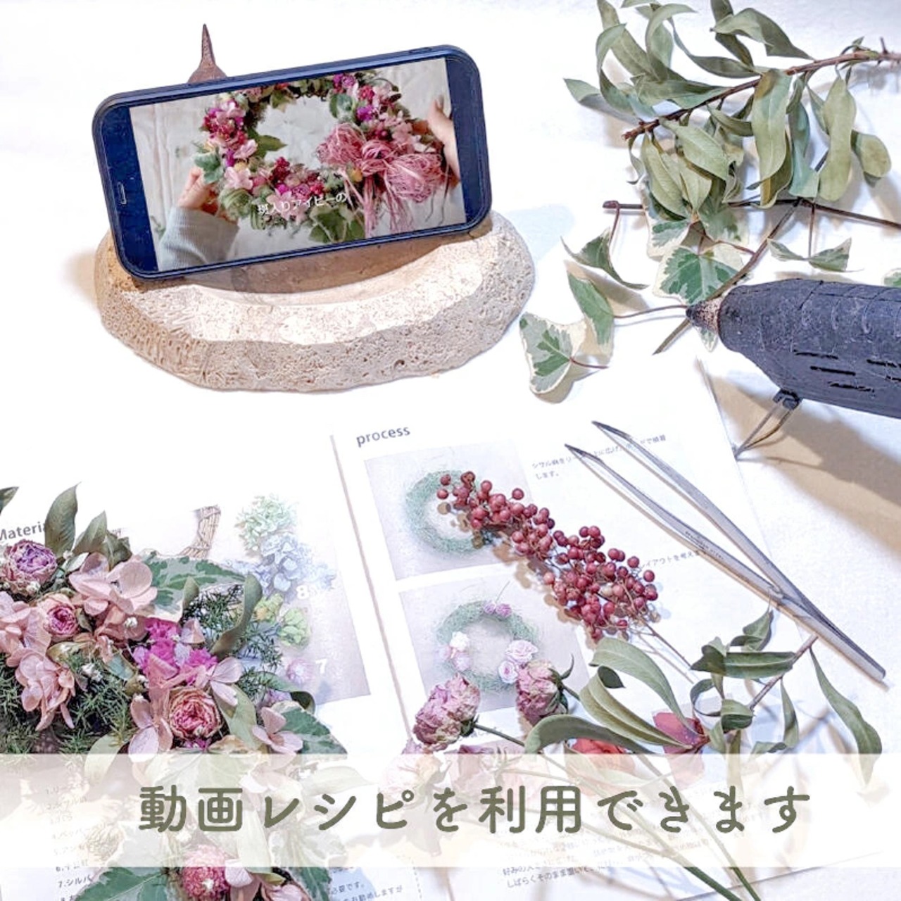 ※花材の詳細につきましては同梱されるマニュアルをご覧ください。このハンドメイドキットは動画レシピをご覧いただけます。URLはマニュアルにQRコードがついています。
