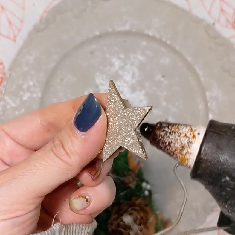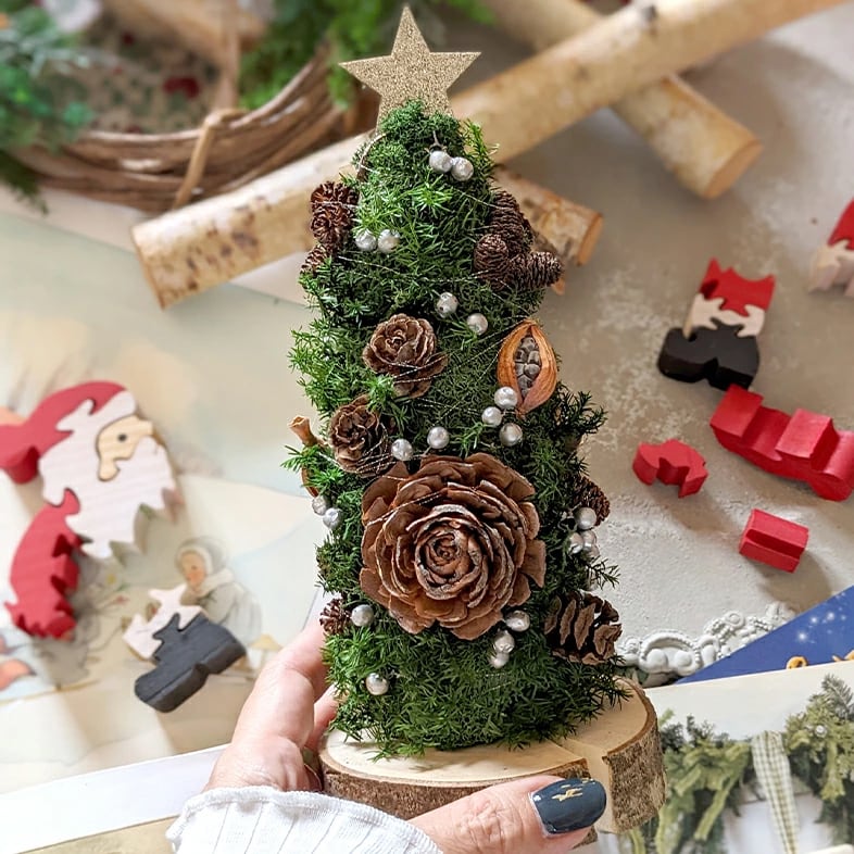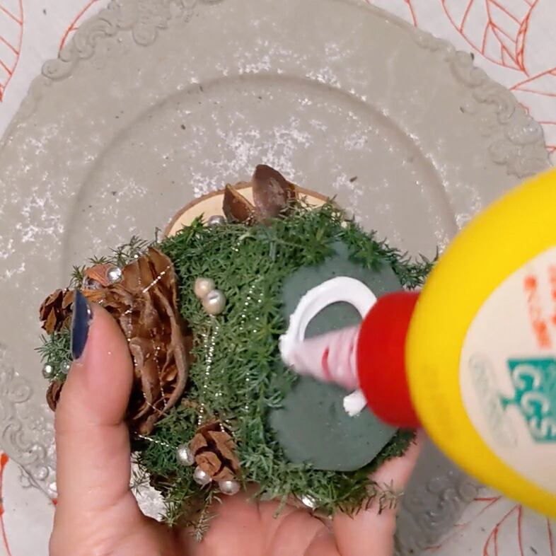 フォームを削ってツリー型を作ったら、モスを貼って、木の実やキラキラワイヤー、トップスターをつけて、あとは切り株にミニツリーを接着して完成です。